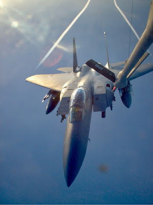 We continued supporting with the orbit, and we Yo-Yo'd one at a time over to a KC-10 tanker holding northwest for us. One jet refueling, the other staying on station overhead with Toxic. Tag-team refueling. This is the way we maintained our constant presence for three hours with Toxic, talking intermittently with updates.