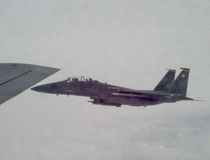 Then, flying as group of three heading west, and at about the seven-hour point in the mission with nearly two more to go, KEGI and I finally relaxed a bit on the left wing of the tanker. I reached down with my left hand to push the G-Suit button and inflate my suit bladders to get my heart activated and wake myself up for the drive. I popped open a can of fizzy Diet Coke for the caffeine.